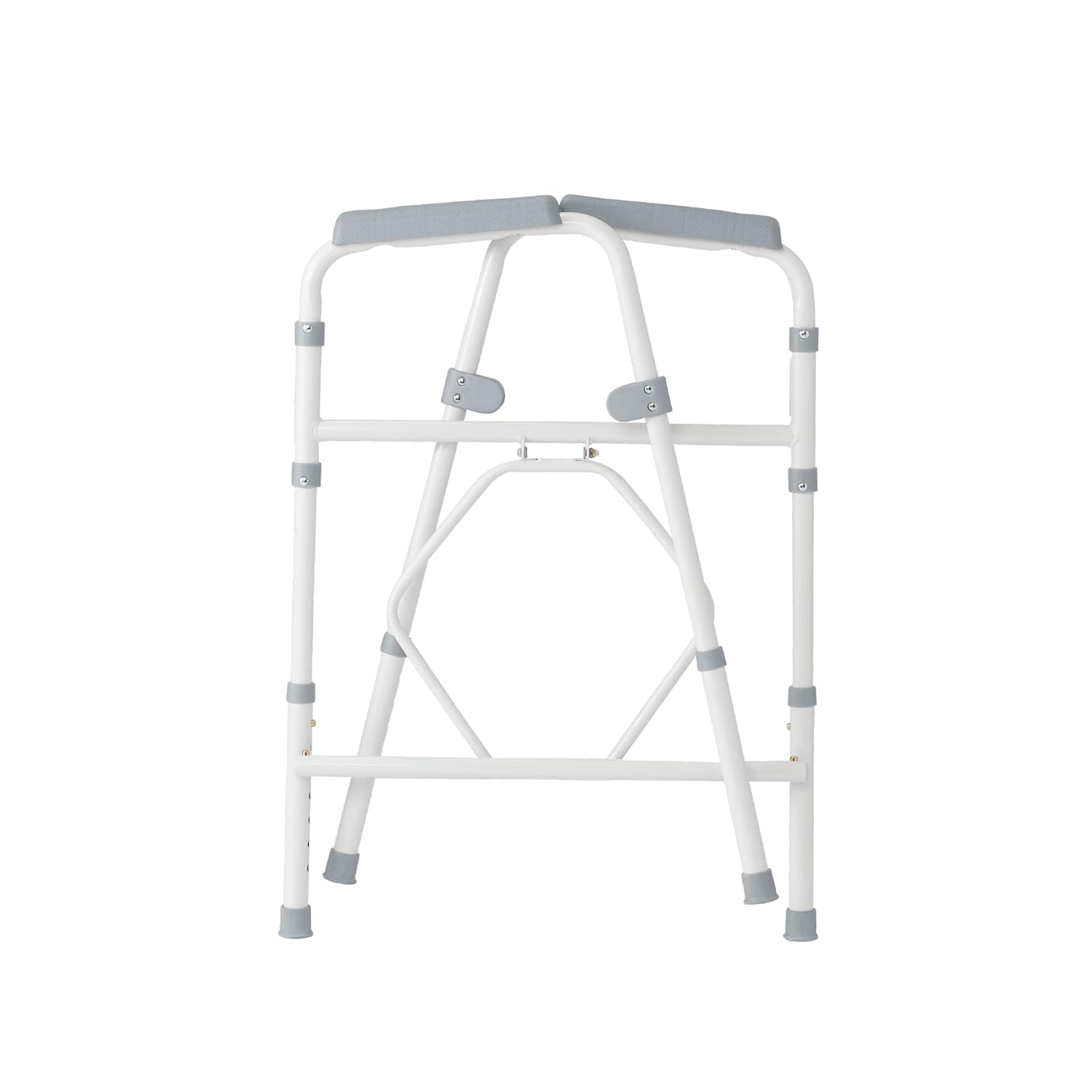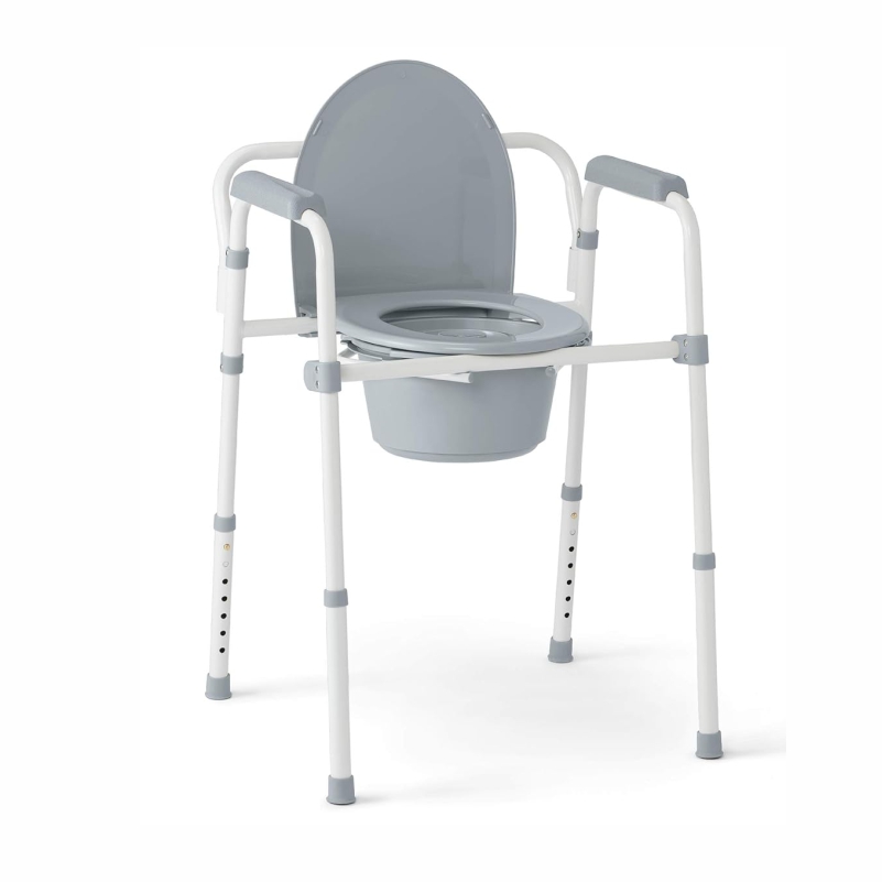 • Folding, height adjustable Medline bedside Commode with 7.5 qt commode bucket with carry handle, cover and splash shield; and durable plastic Snap-On seat and lid