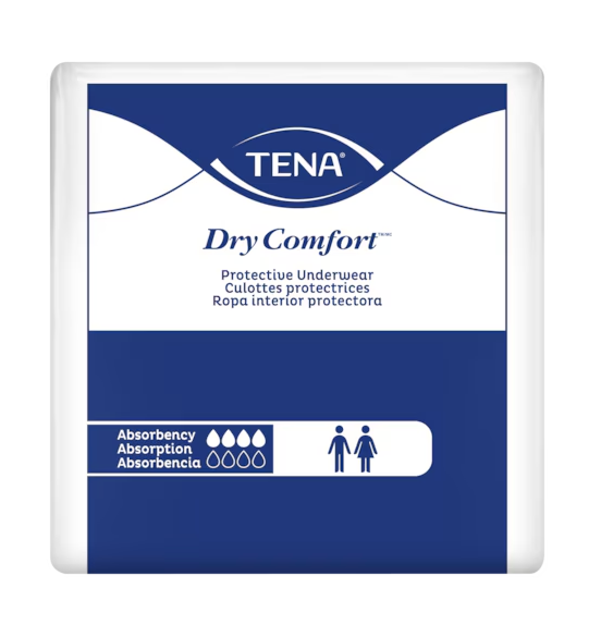 TENA Dry Comfort™ Protective Underwear is soft, comfortable and designed for moderate bladder leakage protection with full coverage. The disposable incontinence underwear uses soft, cloth-like materials and has the look, feel and comfort of regular underwear. The gentle leg gathers and soft waist elastics help provide a comfortable fit and leakage security. They pull-up and down and fit like regular underwear for everyday use and frequent changing. TENA Dry Comfort™ Protective Underwear helps promote an independent and active lifestyle with the Homecare customer in mind.